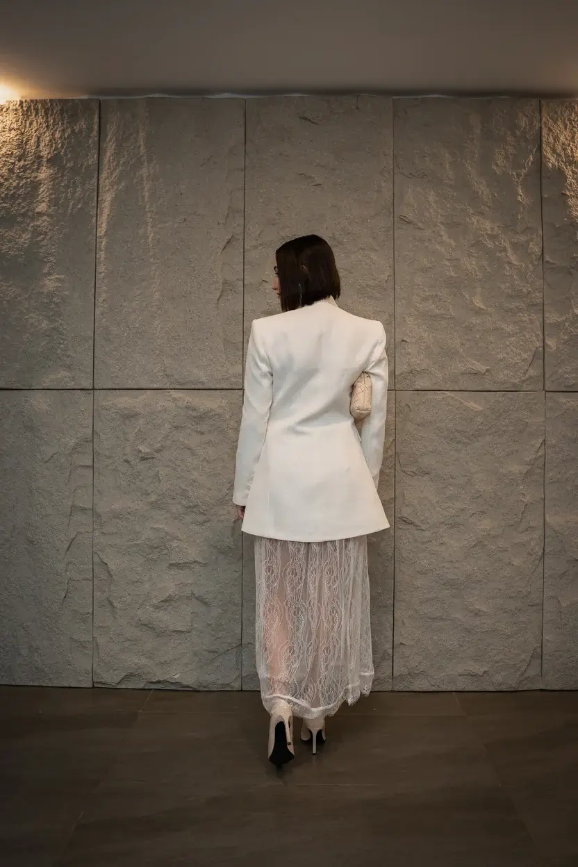 The Veronica maxi blazer dress features the signature Veronica blazer-dress bodice, crafted in refined banana crepe with sharp, tailored lines through the upper frame. The structured top flows into an elongated, full-length lace skirt, creating a refined contrast between architectural tailoring and fluid movement. Designed for elevated evening dressing.